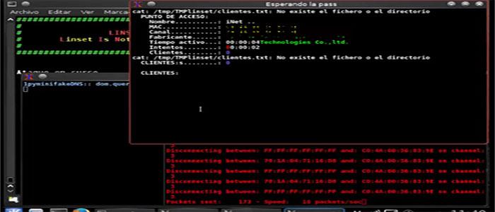 بعدها نقوم باختيار احد اللغات وذلك بالضغط على رقم اللغة ثم انتر enter سوف تظهر لدينا خمس نوافذ تقوم بهجوم حجب الخدمة وقطع الانترنت على المتصلين و انشاء شبكة وهمية عند اتصال الضحية بالشبكة و كتابة الباسوورد الصحيح سوف يتوقف الهجوم وتظهر لك كلمة السر على الشكل الاتي: