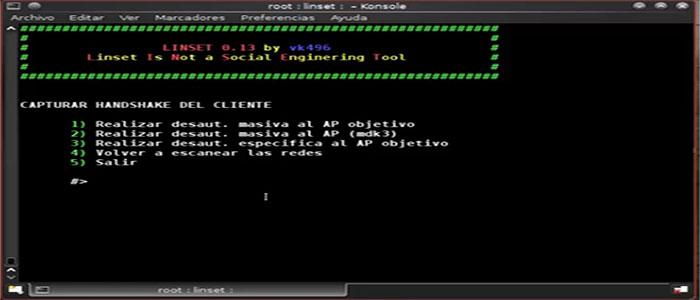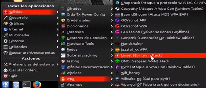 4-بعد الدخول الى النظام نقوم بالدخول الى اداة linset عن طريق الضغط على ايقونة زرقاء اسفل يسار وبعدها ندخل الى wifislax وبعدها الى wpa وبعدها الى اداة linset وصورة توضح ذلك
