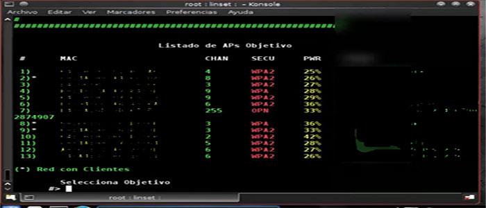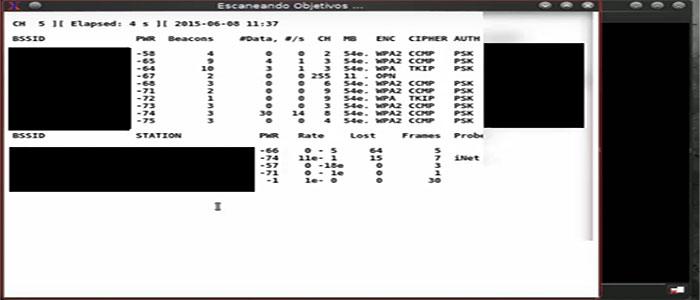 نقوم بوضع رقم الشبكة ثم انتر enter والشبكة التي تكون هناك نجمة جنب رقمها هي شبكة فيها متصلين من الممكن اختراقها بسهولة بعد وضع رقم الشبكة والضغط على انتر enter تظهر لنا صفحة اخرى على الشكل الاتي: