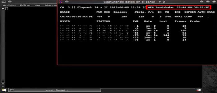 نختار 1 ثم انتر enter سوف يقوم بالهجوم على الشبكة لكي يحصل على الهاند شيك handshake الذي تكلمنا عنه ننتظر حتى تظهر الجملة المؤشر عليها في الصورة كما في الشكل الاتي: