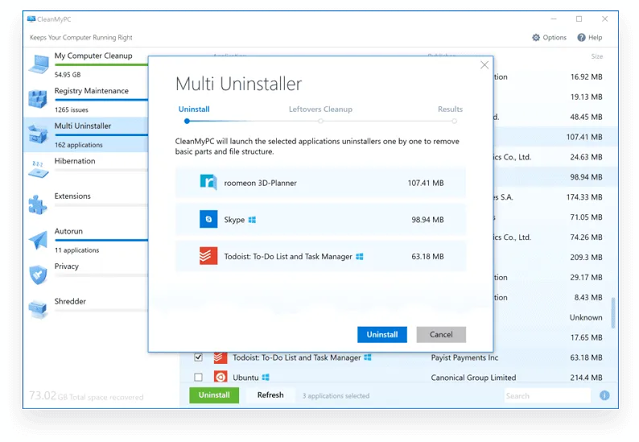 يعد CleanMyPC برنامجًا آخر معروفًا لتحسين أجهزة الكمبيوتر. غالبًا ما يُنظر إلى CCleaner و CleanMyPC على أنهما منافسان أو منافسان. كلاهما يقدم ميزات متطابقة. يحتوي CleanMyPC أيضًا على أداة مساعدة Uninstaller لمساعدتك على إزالة البرامج غير المرغوب فيها والملفات ذات الصلة بها تمامًا لتنظيف هذا الجزء الإضافي من المساحة لمزيد من الأشياء. CleanMyPC هو بالتأكيد أحد أفضل برامج تنظيف التسجيل لأجهزة الكمبيوتر التي تعمل بنظام Windows.